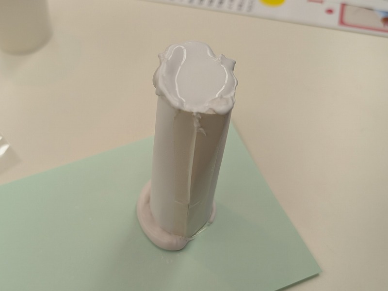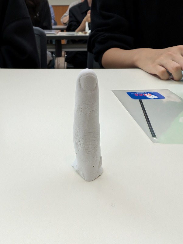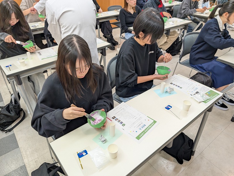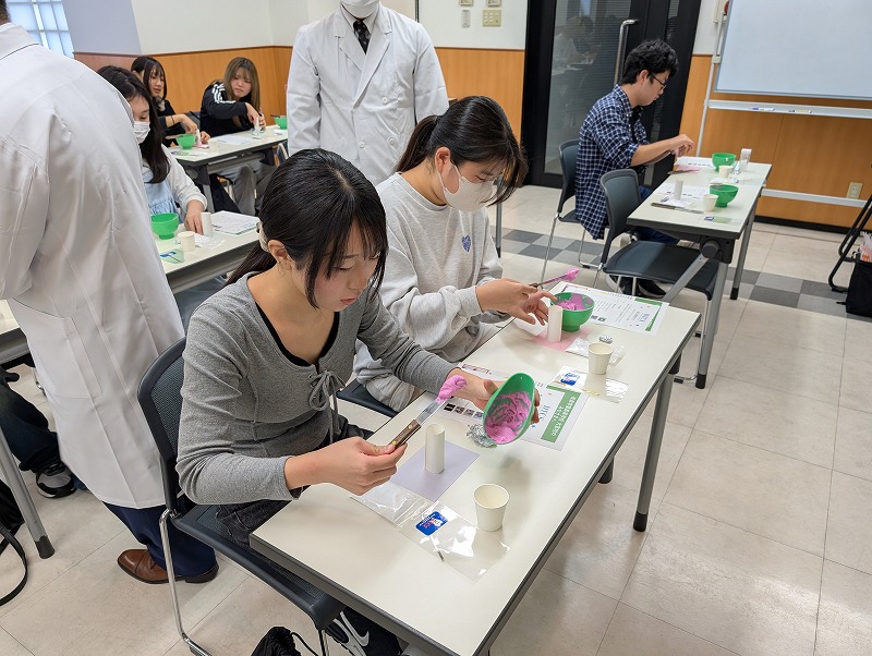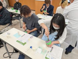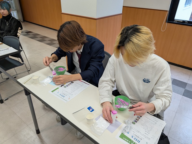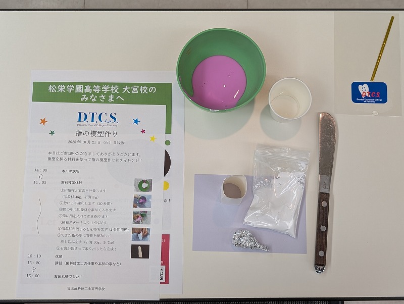 今回は「埼玉歯科技工士専門学校」の先生方をお招きし、歯の型取りに使う材料(印象材)と石膏を使った自分の指の模型作りを行いました。