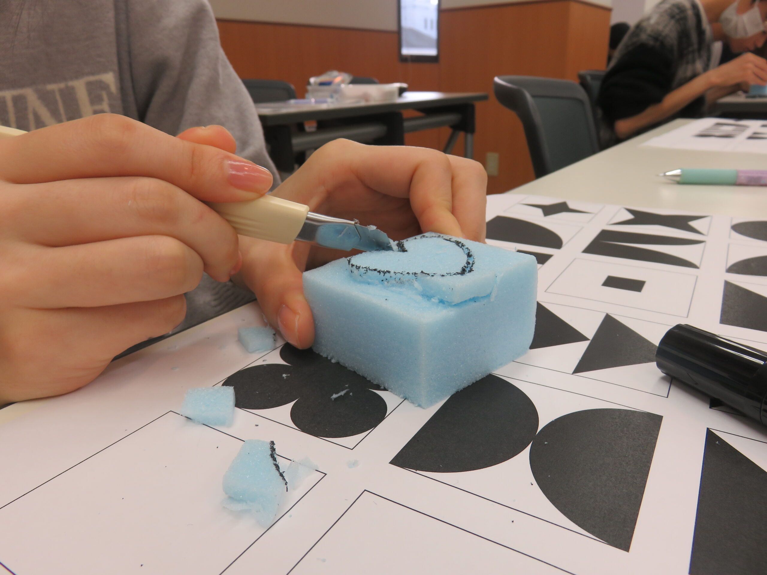 まずは、制作の手順や注意点を聞き、オリジナル柄のハンコを作っていきます。